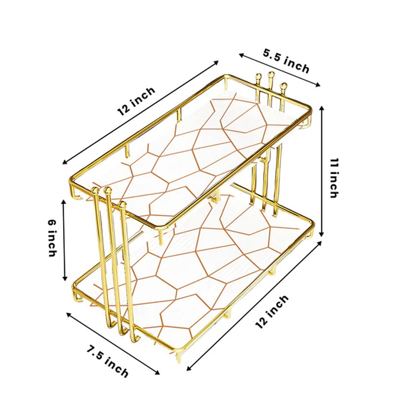 - This 2-Tier Luxury Vanity Storage by Matrix comes with a marble-patterned base (white / black) and gold-toned metal frames. They are designed to sit on a bathroom countertop or your dressing table/counter, providing stylish and organized storage for cosmetics and toiletries.